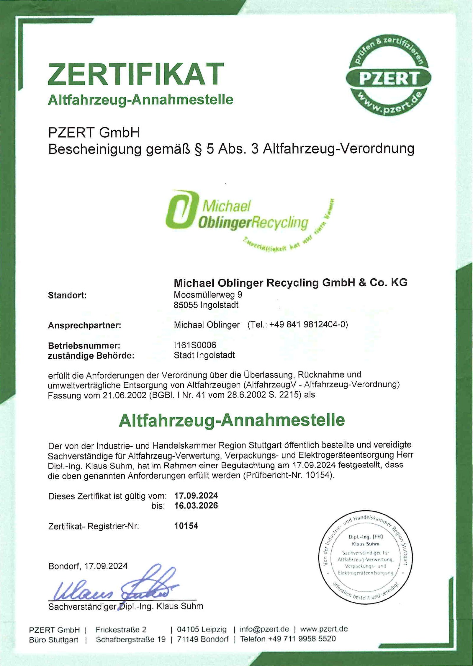 Zum wiederholten Male sind wir erfolgreich als Altfahrzeug-Annahmestelle gem. Altfahrzeug-Verordnung zertifiziert worden. Dieses Zertifikat zeichnet uns erneut als qualitativen und kompetenten Partner im Recyclingbereich aus.